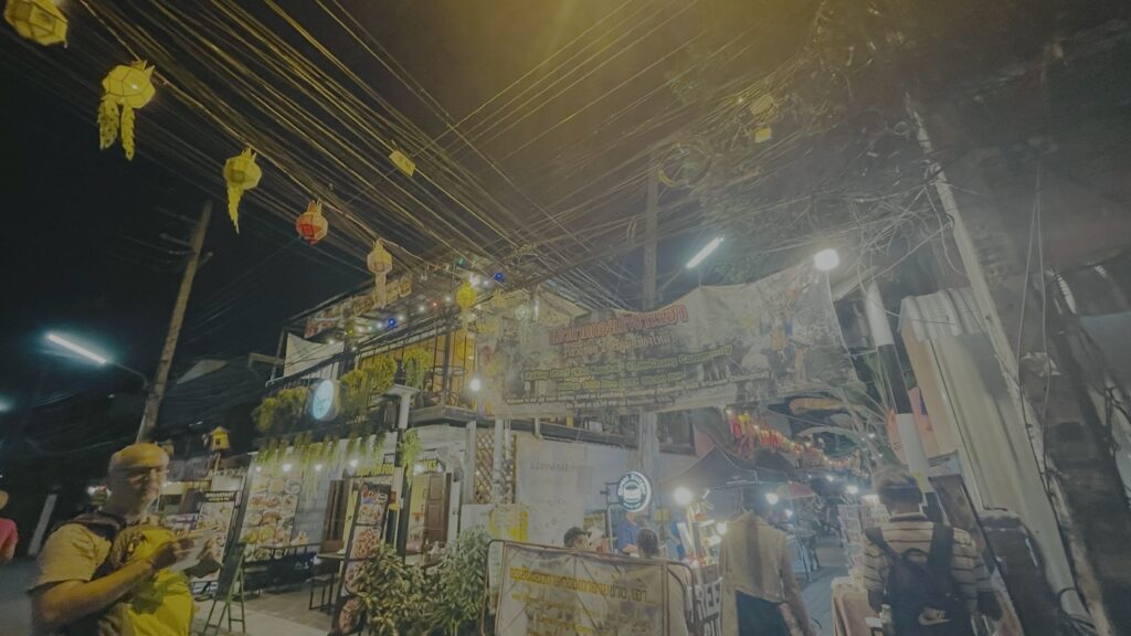 旧市街の「四角」の東門である「ターペー門 (Tha Phae Gate / ประตูท่าแพ / Prà-tuu Thâa Phae)」からまっすぐに、最高の格式を持つ「ワット・プラシン (Wat Phra Singh / วัดพระสิงห์วรมหาวิหาร / Wát Phrá Síng Woramahawihan)」まで1kmに渡って屋台がここぞ狭しと集まっています。